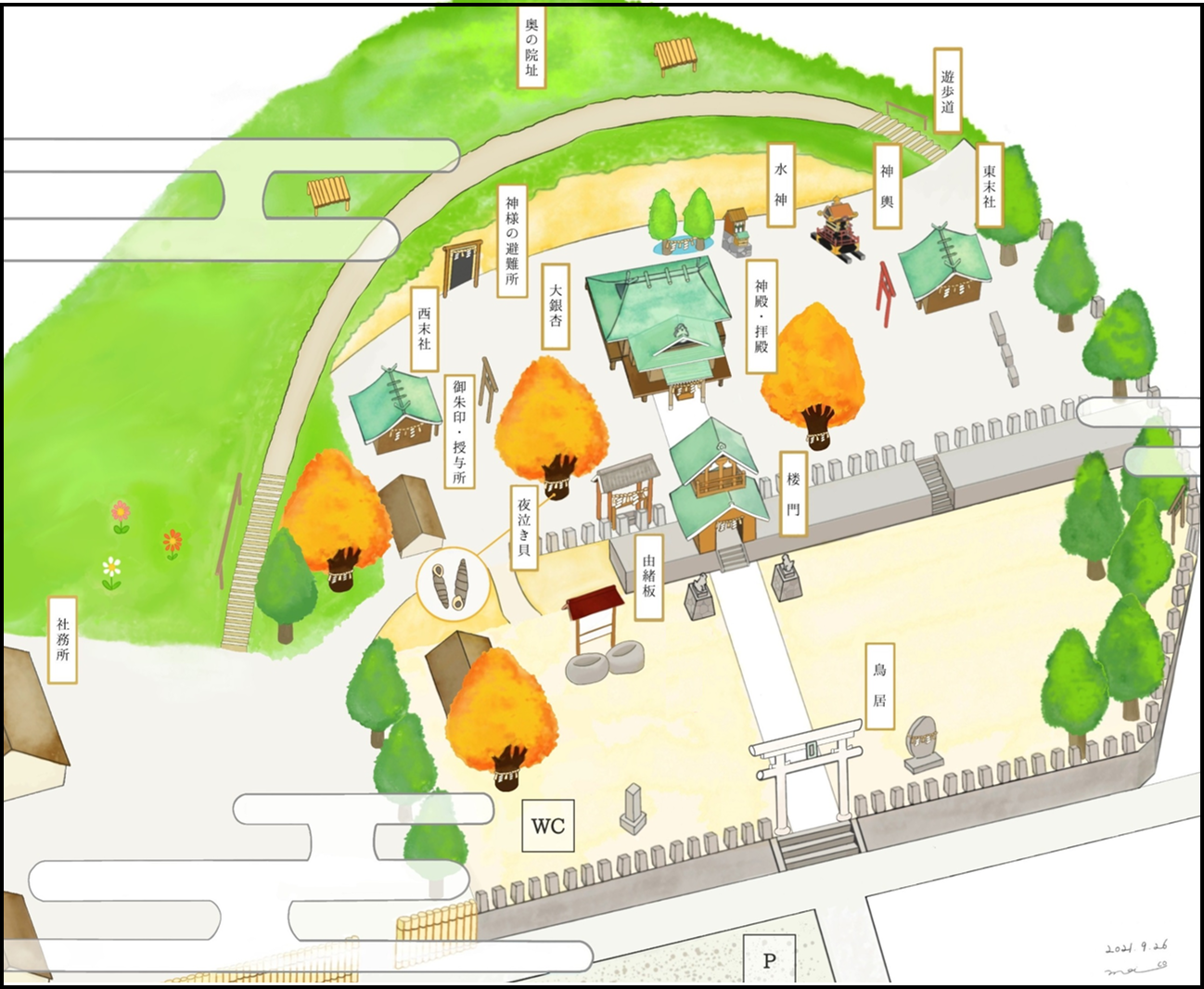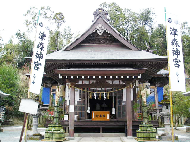 往来此の辺りは入り海の津でしたが、神武帝の霊体出現時よりたちまち森となり、此の地は 「津森」と言われ宮所の名となっています。